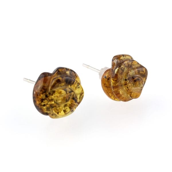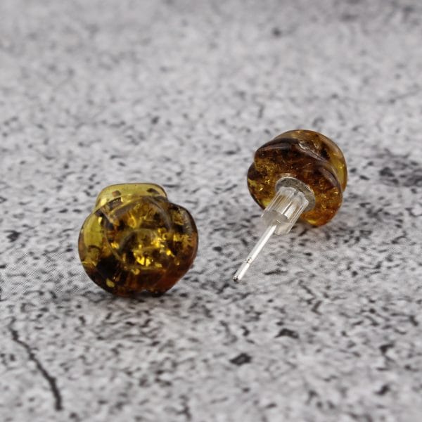Žalios spalvos, rožės formos, natūralaus Baltijos gintaro auskarai vinelės. Kiekvienas gintaro gabalėlis yra unikalus, todėl gaminio išvaizda gali šiek tiek skirtis nuo pavaizduoto nuotraukoje.